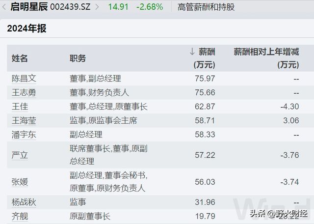 公司高层中,薪酬最高两人是副总经理陈昌文和财务负责人王志勇,2024年分别为75.97万元、75.66万元。