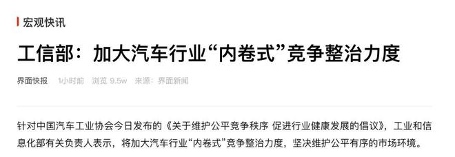 对于中汽协的倡议,工业和信息化部(下称“工信部”)有关负责人表示,将加大汽车行业“内卷式”竞争整治力度,坚决维护公平有序的市场环境。