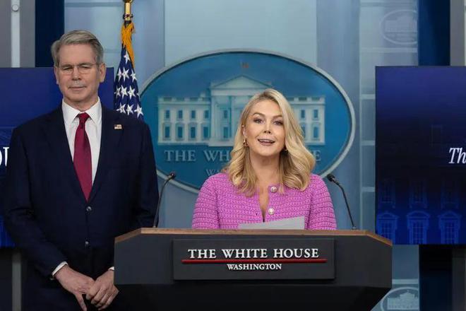 4月29日,美国白宫新闻秘书莱维特(右)与财政部长贝森特在白宫出席记者会,现场记者问了不少有关特朗普挑起关税战以来美国所承受的压力 图:新华社