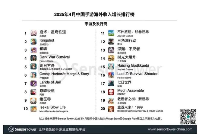 在全盛时代,《原神》曾长期蝉联国产游戏出海收入榜单榜首,即使伴随着游戏生命进入中后期,玩家不可避免地流失,《原神》仍旧能排进月出海收入的TOP20。《崩铁》也同样是国产游戏出海收入榜单上的常客。