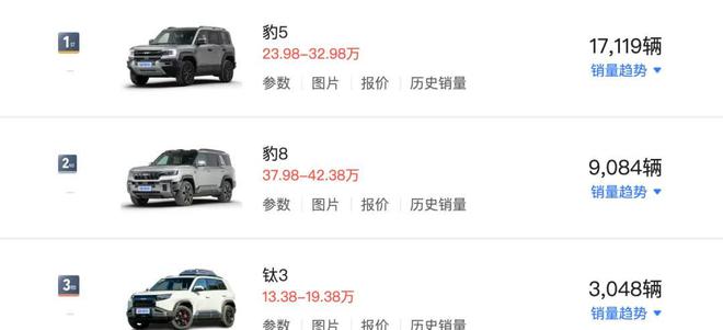 2025年1-4月,腾势品牌累计销量48241辆,目前腾势品牌在售车型包括D9、N9、Z9/Z9GT、N7,但除了D9外,其它车型表现都很一般,其中D9销量为35990辆,占总销量75%,腾势汽车在3月推出了N9,售价分别为38.98万元和44.98万元,4月销量5018辆,整体表现尚可,但后市能否延续高销量还不得而知。至于方程豹品牌,其目前有三款车型在售,包括豹5、豹8和钛3,累计销量29251辆,算起来月销量在7000辆左右,其中豹5为17119辆,豹8为9084辆,而最新推出的钛3在4月销量为3048辆。