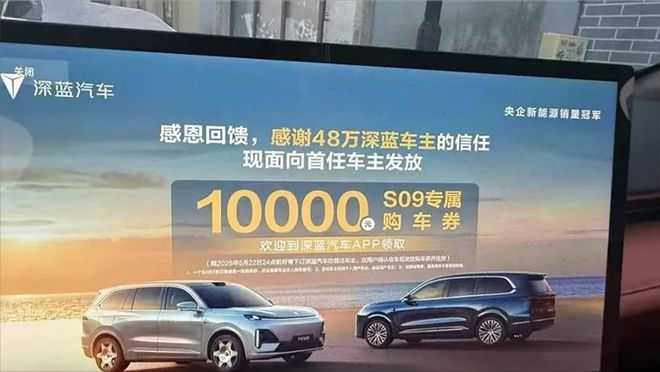 根据多位车主提供的截图,此次广告投放采用车机系统强制开屏形式,画面占满整个中控屏幕,内容显示为“感谢48万深蓝车主的信任,现面向首任车主发放1万元深蓝S09专属购车券”。