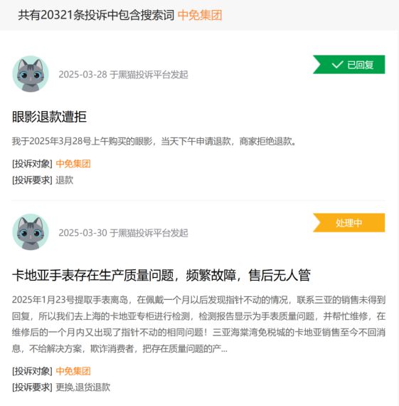 另外,目前,黑猫投诉平台上关于中免集团的投诉信息达两万余条,除了上述报道中提到的积分问题,还有商品质量和售后问题。 部分消费者称,在中免旗下的店铺购买到的商品存在不少质量问题,例如新买的唇油中有异物、防晒霜已过保质期、喷雾喷头瑕疵严重等。