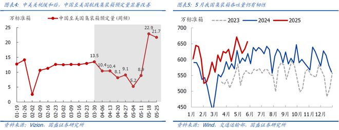 :货运公司Vizion和物流平台FreightWaves数据显示,中美和谈后的两周,中国至美国航线的集装箱预定量较5月初低点大幅提升,超过了对等关税宣布前的水平,出现“抢出口”脉冲;5月全月中国至美国航线的集装箱预定量环比增54.2%,同比降幅收窄至12.5%。同时,“抢转口”强度仍不低,Marine Traffic数据显示,5月越南港口到港、离港船舶数量同比分别为23.0%、20.2%,续创历史同期新高。整体看,5月我国出口仍有韧性:①集装箱吞吐量:按照交通部统计数据,5月以来,我国集装箱吞吐量同比增5%,环比增0.8%;②离港船舶载重量:按照亿海蓝数据,5月我国离港船舶载重吨同比增1.5%,环比增2.8%。