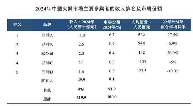 排名第一的品牌A人均消费则是97.5元,据《招股书》介绍,品牌A成立于1994年,为一家上市公司,总部位于中国四川省简阳市,专门经营四川火锅,2024年收入413亿元。