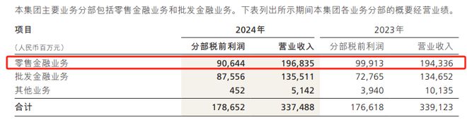 2024年,其零售业务却出现“增收不增利”现象,收入1968.4亿元,同比增长1.3%,税前利润906.4亿元,同比下降9.3%