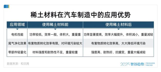 汽车行业有个说法,“无稀土,不成车”。在汽车电机中加入稀土材料,可大幅提升电机的功率和效率;在尾气净化催化剂加入稀土元素铈,可让提高尾气净化效率,减少环境污染;在轮毂等零部件中加入稀土材料,可以提升车身的强度和耐热性。
