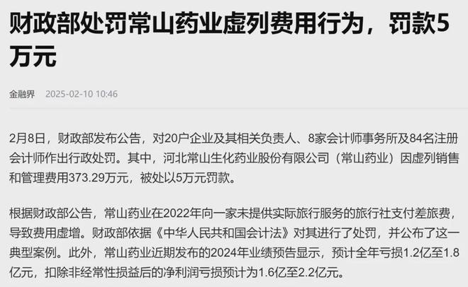 业绩巨亏之外,常山药业内部治理也有严重问题。今年初,常山药业因为虚列销售费用和管理费用,被罚款5万元。