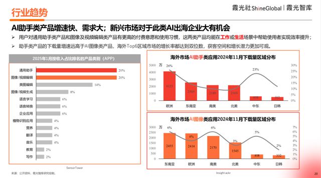 用户对通用助手类产品和图像及视频编辑类产品有更高的付费意愿和使用习惯,这两类产品均能在工作或生活场景中帮助使用者实现效率提升。助手类产品的下载量增速远高于AI图像类产品,海外Top6区域市场的增长率都达到双位数,获客空间和增长潜力更加可观。