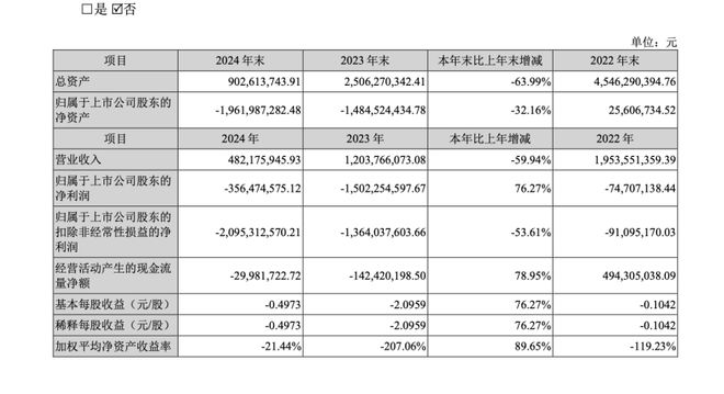 公司此前发布的业绩报告显示,2024年,公司实现营业收入4.82亿元,同比减少59.94%,归母净利润为亏损3.56亿元。截至2024年末,公司归属上市公司股东的净资产为-19.62亿元。