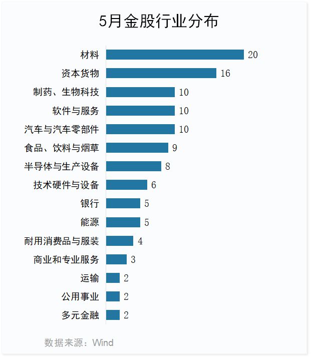 Wind数据显示,截至5月1日,16家券商共推荐115只金股。从所属行业来看,与涨价主题相关的材料排名第一,资本货物第二;汽配、软件、医药、食品饮料、半导体等排名靠前。