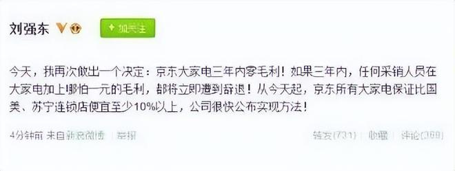 2012年,京东、苏宁和国美之间爆发的“价格战”,就是以刘强东在微博向苏宁、国美“开炮”为导火索。当时刘强东通过微博宣布,京东商城所有大家电将在未来三年内保持零毛利,并给出“保证比国美、苏宁连锁店便宜至少10%以上”的承诺。这种公开喊话、直接锁定对手的做法,用现在的话来说,也称得上是简单粗暴、朴实无华。
