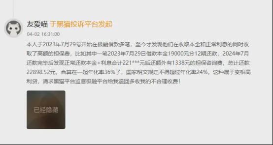 4月2日,在黑猫投诉平台上,一位用户投诉在2024年8月还款完毕后,发现额外还有担保咨询费,合算在一起年化利率36%。