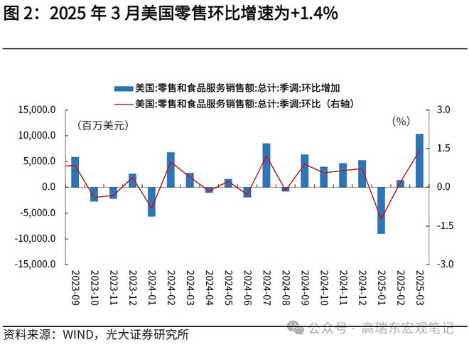 3月零售数据高于市场预期,环比增速大幅上行,或与关税扰动有关。4月初特朗普大规模关税落地,为规避涨价风险,3月美国消费者进行大量采购,关税扰动导致美国消费前置,3月零售环比增速升至+1.4%,较2月的+0.2%明显回升。但3月美国消费者的提前采购行为,将会透支未来的消费需求,后续零售数据或有转弱风险。
