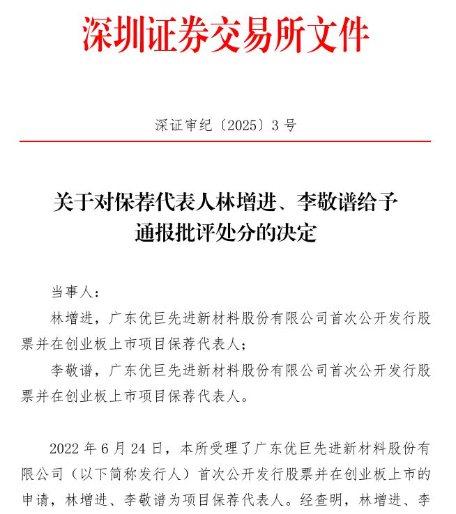 红星资本局查阅中国证券业协会网站公布的处罚处分信息发现,上述多名保代中,林增进曾在今年1月被深交所通报批评。2022年6月24日,优巨新材创业板IPO被受理,最终于2024年4月19日因撤单被终止审核。林增进作为项目保荐代表人,因未审慎核查等违规情况,被深交所给予通报批评的处分,并记入诚信档案。
