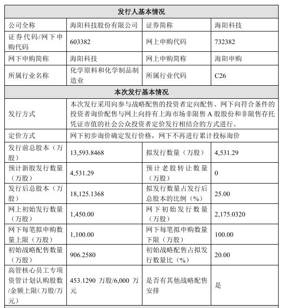 公司全称为海阳科技股份有限公司;证券简称为海阳科技;证券代码/网下申购代码603382网上申购代码732382;网下申购简称海阳科技;网上申购简称海阳申购;所属行业名称为化学原料和化学制品制造业所属行业代码C26