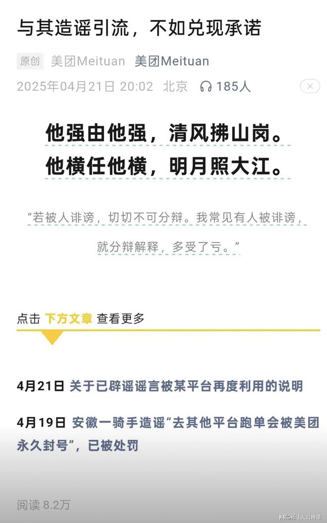 4月21日晚,美团通过微信公众号发文:“他强任他强,清风拂山岗。他横任他横,明月照大江。”“若被人诽谤,切切不可分辨。我常见人有人被诽谤,就分辩解释,多受了亏。”疑似回应今天京东曝光其强迫骑手“二选一”传闻。