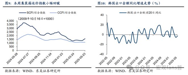 出口数量方面,韩国5月前20日出口总额同比增速录得-2.40%,较4月回升2.90个百分点,较去年回落3.90个百分点。国内方面,5月12日-5月18日监测港口累计完成货物吞吐量录得26397.0万吨,环比回升0.5%。