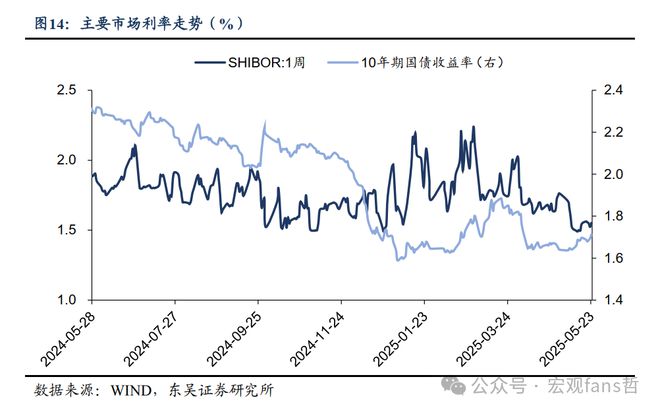 ELI指数:截至2025年5月25日,本周ELI指数为-0.90%,较上周回升0.06个百分点。存款“降息”或加剧银行“负债荒”。截至5月20日,7日“一行一局一会”新闻发布会上部署的“降息”全部落地,在7天期逆回购操作利率调降10bps的带动下,本月LPR报价等幅度下调10bps,并传导至银行存款挂牌利率下调。本轮“降息”更加侧重“稳息差”,相比贷款利率,存款挂牌利率调降幅度更高,1年期定存利率下降15bps至0.95%,3年期和5年期定存利率分别下调25bps至1.25%和1.30%,存款“降息”或继续推动存款“搬家”至资管产品,而在贷款要合理增长的背景下,存款“搬家”或推动银行体系负债端压力上升,一季度曾经出现过的“负债荒”风险或重现:(1)从“价”上看,同业存单到期收益率反应迅速,5月20日后同业存单利率开启上行,AAA级1年期同业存单到期收益率从1.67%抬升至1.6950%,而同期DR007则从1.60%下降至1.5860%,资金面均衡宽松的态势下同业存单利率反而上行,显示资金市场预期存款“降息”或导致银行在“负债荒”压力下加大同业存单发行量;(2)从“量”上看,6月份同业存单到期规模较高,根据Wind统计,6月份将有4.14万亿同业存单到期,单月到期规模处于近两年来最高,若5月至6月贷款投放景气度回升,同业存单市场将既有较高的到期续发压力,亦有净融资风险,或进一步加剧银行体系“负债荒”,资金面供需和资金利率预期均有重现3月份较高波动的风险。从资金需求传导至货币政策操作看,5月15日“降准”释放约1万亿基础货币,对于稳定银行负债有积极作用,同时5月23日央行开展5000亿元MLF操作,本月净投放3750亿元,为连续第三个月加量续作,且MLF中标利率水平或继续贴近同业存单融资利率,预计银行体系“负债荒”或推升MLF投标需求,若MLF连续加量投放,对冲“负债荒”压力,那么同业存单利率的上行空间或有限。