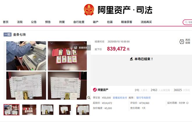 红星资本局注意到,由于这些金条的起拍价低于当前黄金的市场价,引发了大量的关注。截至拍卖结束,共有141人报名参与拍卖,2463人设置提醒,获得36025次围观。
