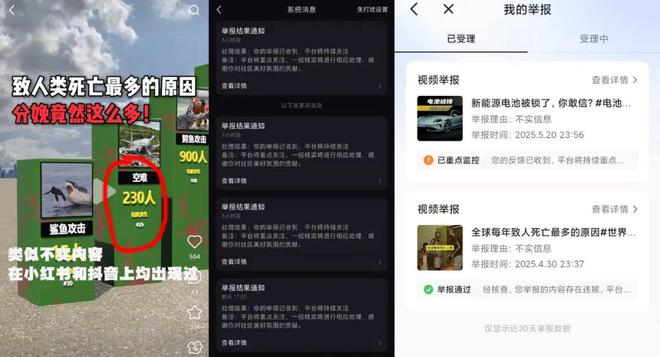 在举报反馈方面,小红书仅仅表示“平台将持续关注”,相较之下,抖音很快对视频进行了“举报通过”的评判。