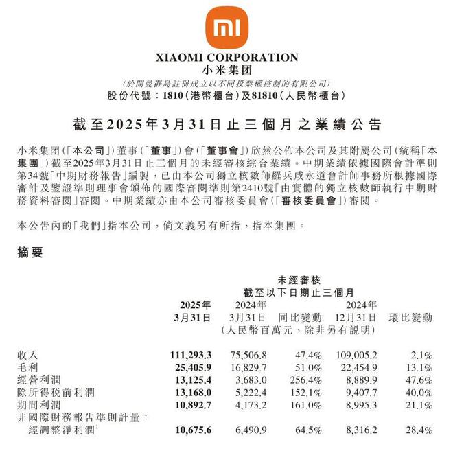 小米集团财报显示,2025年第一季度小米集团营收为1113亿元,为小米集团连续两个季度超千亿,同比增长47.4%,创历史新高;经调整净利润为107亿元,首超百亿,同比增长64.5%,同样创历史新高。小米集团业务主要分为两大板块,其中智能电动汽车及AI等创新业务分部总收入为186亿元,智能电动汽车收入为181亿元,占比高达97%,智能电动汽车及AI等创新业务经营亏损5亿元,亏损明显收窄。