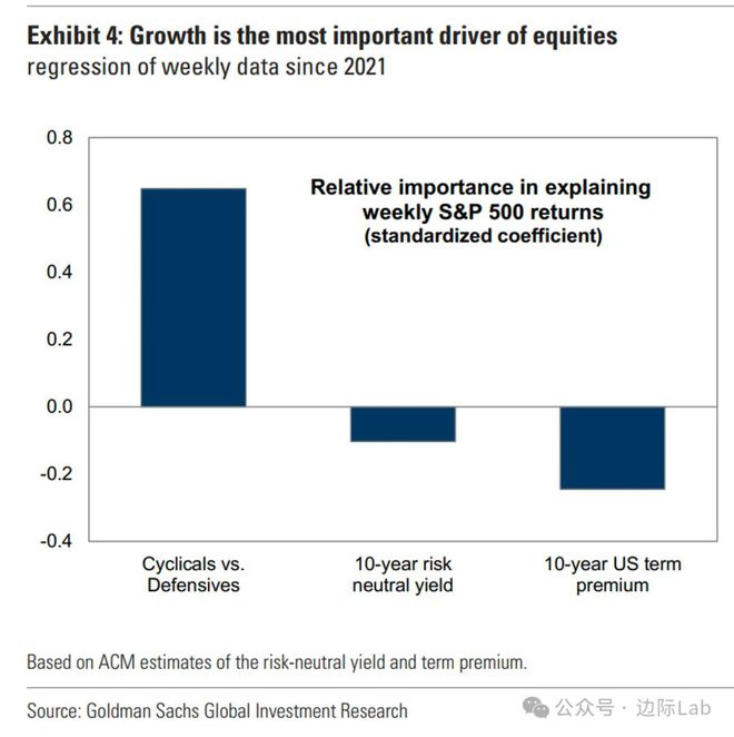 6.高盛研究发现,推动美股走势的核心因素是经济增长预期,而不是利率本身。自2021年以来,经济增长相关指标(如周期股与防御股表现差异)对标普500的解释力,是10年期期限溢价的3倍、是风险中性利率的6倍。