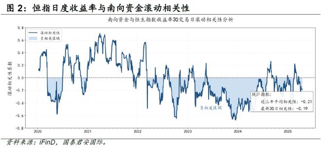 南向资金有“逆势操作”的风格特点。统计结果显示,在30个交易日滚动区间内,南向资金净买入额与恒指对数收益率近3年的Pearson相关系数整体平均值为–0.21,展现出一定的负相关性,说明南向资金在港股市场的行为具有一定的“跌买涨卖”特点。更重要的是,在极端情景下,两者的相关系数甚至强化至–0.65,有效反映出南向资金在港股市场“越跌越买”的逆势逻辑。以日度样本进行散点回归检验,Pearson相关系数为负且在统计上显著(p